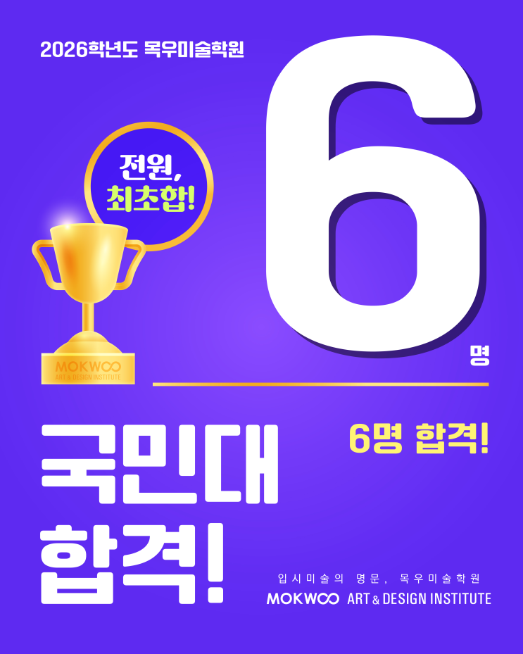 안녕하세요! 인계목우 고2디자인반 채연쌤입니다. 오늘은 아주 좋은 소식을 들고 왔는데요, 바로바로 2026 국민대 합격 소식입니다! 시간이 훅훅 지나가서 벌써 다군은 시험이 끝나가고 가군은 발표가 나고 있는 시점인데요, 정시 가군에 속해있는 국민대학교도 얼마 전 합격발표가 났더라구요. 국민대...사실 디자인 입시를 치루는 친구들에게는 정말정말 가고 싶은 꿈의 학교 그 자체죠. 그런 국민대에 목우미술학원 친구들은 올해 무려 6명이나! 전원 최초합으로!! 합격했습니다!!! 단 한 명도 예비가 아닌 '전원 최초합'이라니, 목우미술학원만의 독보적인 결과랍니다 그리고 제가 몰래 얻어온 정보....... <img src="https://blogthumb.pstatic.net/MjAyNjAxMjNfMTQ5/MDAxNzY5MTY0NjgxMjg4.RzeY0iq4cW7x3bNq7MuT68r134abz759miHD7-NdYfAg.GDpQWvCFUKvrfQCjYmw8yRBaEUTm-djCZqrntfR9LgAg.PNG/image.png?type=s3" />