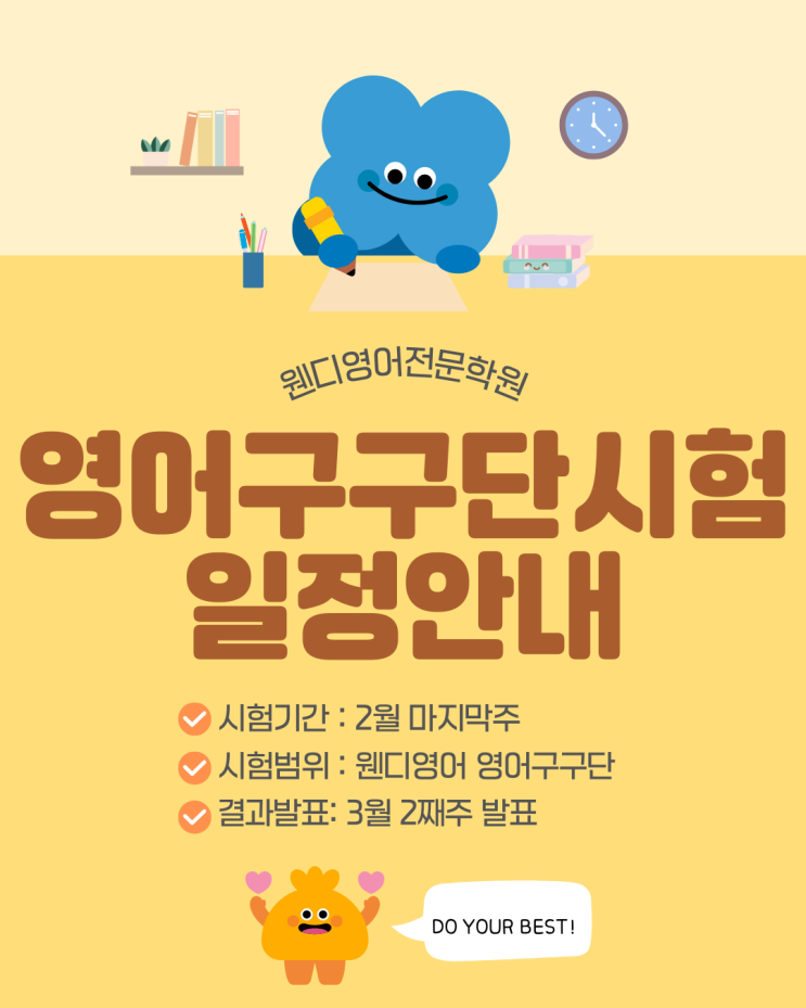 이번 겨울이 참 길어보입니다. 2월은 참 짧고도 긴것 같은 느낌은 저만 그런건 아니겠지요~ 겨울동안 3월을 대비하고 준비하는 학원에서는 마음이 바쁩니다. 당장 3월부터 고학년이 되는 친구들 걱정이 부쩍 많이 들기 때문입니다. 영어의 난이도가 오르기도 하고 중학생이 되는 친구들은 학습량도 많이 늘어야 하는 시기이기도 해요. 2월을 알차게 보내기 위해 웬디영어전문학원에서 영어구구단 시험을 준비했습니다. 영어구구단이 뭘까요? 꼭 알아야 하는 개념들만 묶어서 집중적으로 연습하고 시험을 보고자 합니다. - 날씨 / 계절 / 월 / 요일 - 명사의 복수형 - 대명사 - 인칭대명사 / 재귀대명사 - 숫자/ 서수/ 큰 수의 단위표현 - 불규칙....... <img src="https://blogthumb.pstatic.net/MjAyNjAyMDlfMjcw/MDAxNzcwNjE4NTc5ODE3.FdgopOXlEG5viGOchlXyiPCMyX7itueK1Ia6ph8FeFUg.8lx-J_xNii10AXyLz7cthPkBXFPZYIsSzib5q8xU-osg.PNG/%BF%B5%BE%EE%B1%B8%B1%B8%B4%DC_%BD%C3%C7%E8%BE%C8%B3%BB_-%C0%A2%B5%F0%BF%B5%BE%EE.png?type=s3" />