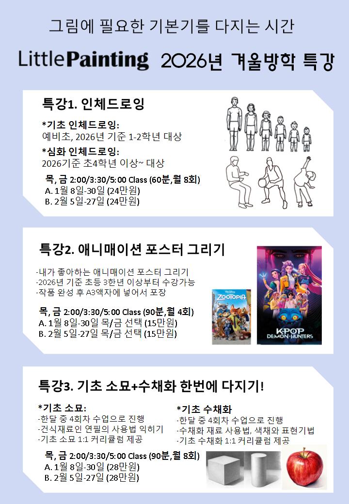 #분당미술학원 #미금미술학원 #정자동미술학원 #초등미술 #유아미술 #성인미술 #소묘반 #수채화반 #방학특강 #2026년겨울방학 #미술특강 #분당미술 2026년 겨울방학을 알차게 보내는 방법! 리틀페인팅 미술교습소는 2026년 1월 8일- 2월 27일 겨울방학기간 동안 아이들이 그림과 친해질 수 있는 겨울방학 특강을 진행합니다. 모든 수업은 연령별 난이도별 1:1로 수업이 진행됩니다. *신청은 선착순으로 마감되며 최대정원 4-5명으로 이루어진 소수정예 수업으로 진행됩니다. 그림의 기본기가 필요할 때 집중적으로 미술수업을 수강할 수 있는 기회를 놓치지 마세요! 수업문의 010-8226-1645 | 카카오채널 @리틀페인팅 https://m.blog.naver.com/l....... <img src="https://blogthumb.pstatic.net/MjAyNTEyMzFfNzYg/MDAxNzY3MTUwMTcyNjEw.0u_JehpkyobRZVVllmr-YNWUi6uFGbTbhqnegdvC6mkg.LHot1FxrH8oXLgb_PRzXfH0vAdzlTxXKpf1-5bxnWLwg.JPEG/1767150152491.jpg?type=s3" />