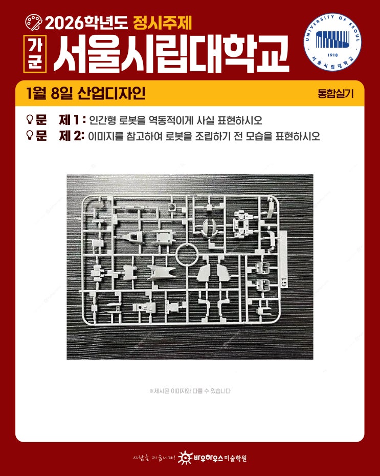 안녕하세요️ 분당 미대입시전문 바우하우스 미술학원입니다! 1월 8일, 서울시립대 산업디자인 정시 실기 시험이 있었는데요 산업디자인 실기시험에서 출제된 문제와 제시물, 작년과 올해 서울시립대 산업디자인과 정시 경쟁률까지! 모두 알려드릴게요❗❗ 2026학년도 서울시립대 미대 정시 산업디자인 주제 문제 1 인간형 로봇을 역동적이게 사실 표현하시오 ️문제 2️ 이미지를 참고하여 로봇을 조립하기 전 모습을 표현하시오 2026학년도 서울시립대 산업디자인 정시 경쟁률 26학년도 서울시립대학교 산업디자인과와 시각디자인과의 정시 경쟁률입니다✅ 지금까지 2026학년도 서울시립대 산업디자인 정시 모집의 실....... <img src="https://blogthumb.pstatic.net/MjAyNjAxMTJfMjkw/MDAxNzY4MTgxNzgwNDg1.6vDuZd2zl6HZuUJJKGUcLs02wCnSEFnO2xNFz7QNi3sg.xl6u87lNGp25SqGYibN79JQsFvdk0sGJE7yoGX6e8XUg.JPEG/2026%C7%D0%B3%E2%B5%B5_%C1%A4%BD%C3%B9%AE%C1%A6_%BC%AD%BF%EF%BD%C3%B8%B3%B4%EB_%BB%EA%BE%F7%B5%F0%C0%DA%C0%CE.jpg?type=s3" />
