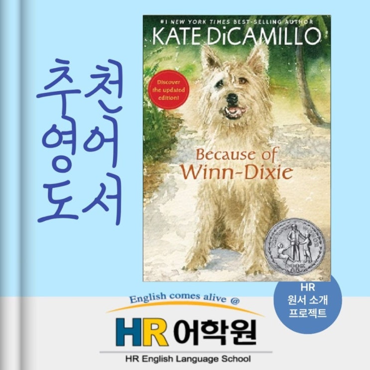 HR 어학원 초5학년 친구들이 수업하는 책 "Because of Winn-Dixie" Book Level : 3.9, AR Points : 3.0 HR 중등 Honors Class 수업에서 사용하고 있는 The Tale of Despereaux와 Flora & Ulysses의 저자 Kate Diccamillo의 작품입니다. 2000년 Newbery Honor상을 수상한 명작으로 2007년 미국 전국교육협회(NEA)는 "교사가 선정한 어린이를 위한 최고의 책 100선" 중 하나로 선정되었습니다. 모든 연령대의 사람들에게 사람들을 어떻게 대해야 하는지에 대한 진실된 교훈을 주고 있습니다. HR어학원 원어민 선생님 Daniel의 추천사 This month, 5th grade students are beginning Because of Winn-Dixie, a Newbery Hono....... <img src="https://blogthumb.pstatic.net/MjAyNjAzMTZfMjgw/MDAxNzczNjUxMjM5NTcx.XW2l-sRsNreYjbZAMBXZl8hYOTmIwvkNIql9cZK2-EMg.jLwd7T0_xlDnsb7_sNubRhJS3n6giXOd424nuWJKP2Qg.JPEG/Because_of_Winn-Dixie%B4%EB%C7%A5%C0%CC%B9%CC%C1%F6.jpg?type=s3" />