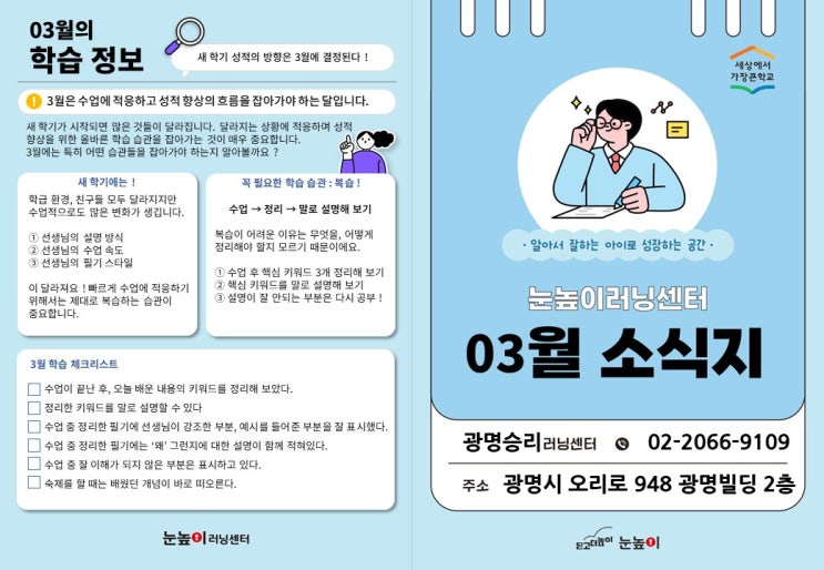 긴 겨울방학이 끝나고 새학년 새학기가 시작되는 3월입니다. 새롭게 입학하는 학생들 모두 축하하고 새로운 학교 생활도 잘 해 나가길 바랍니다. 3월은 영어로는 March, 로마의 전쟁신 Mars에서 유래해 군대의 행진을 시작하는 달이라는 의미가 담겼습니다. 옛말에 "시작이 반이다"라는 속담이 있는데 이말은 ‘시작이 좋으면 끝이 좋다’라는 말과 함께 쓰이기도 하지요 그만큼 시작이 중요하다는 뜻이겠지요 공부도 당연히 시작이 중요합니다. 새롭게 바뀐 교과서 내용을 이해하고 진도에 맞춰 예습, 복습을 철저히 하게 되면 아이들은 자연스럽게 공부에 대한 자신감을 갖게 되어 학교 생활을 더 즐겁게 할 수 있을겁니다. 새롭게 시....... <img src="https://blogthumb.pstatic.net/MjAyNjAyMjRfMjEz/MDAxNzcxOTE1MjA2OTg5.LqLnuPr7PIm_6HJngDZJCVMo_nGa7cJJf01V6ASBGSYg.2VCZVkSK1NTPIs1GykEd7DqdUn4v0a1QYEVe4Zj9i2sg.JPEG/%BD%BD%B6%F3%C0%CC%B5%E51.JPG?type=s3" />