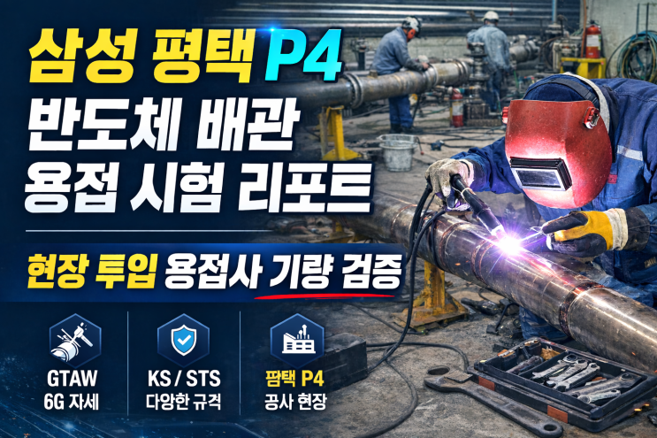 2026. 03. 12 삼성 평택 P4 PROJECT 반도체 배관 용접사 기량테스트 기술 리포트 2026년 3월 12일 경기도 평택에 위치한 다온용접학원 시험장에서 삼성 평택 P4 PROJECT 공사 투입을 위한 배관 용접사 기량 테스트가 진행되었습니다. 이번 시험은 단순 기능 시험이 아니라 삼성 반도체 배관 공사 투입 전 최종 검증 성격의 실기 시험으로 진행되었으며 실제 현장에서 요구되는 GTAW 배관 용접 품질 기준을 기반으로 평가가 이루어졌습니다. 최근 삼성전자 평택캠퍼스는 P4 라인을 중심으로 반도체 생산 능력 확대와 공정 설비 증설이 지속적으로 진행되고 있으며 이에 따라 고순도 배관(UHP piping) 및 유틸리티 배관 시공 인력 수요가 꾸준히 증....... <img src="https://blogthumb.pstatic.net/MjAyNjAzMTJfMjUg/MDAxNzczMjk5MTM1NDk5.NRpSrAy_eepqSPUaiLsZwhlQNR9RkjgSXt7nghYiLRwg.-Xdu9r1b4Fsy-tMJsBqFN2FCLwhlfZK_aOIxdP7EEsIg.PNG/3%BF%F9_10%C0%CF_%BD%E6%B3%D7%C0%CF.png?type=s3" />