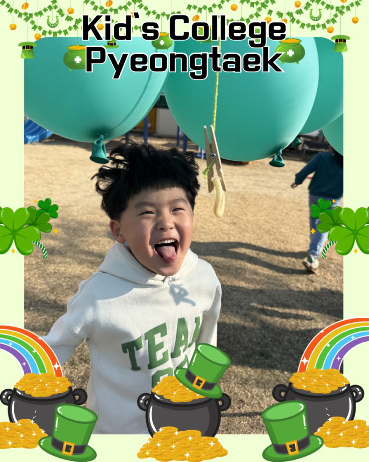 Saint Patrick’s Day 영어를 교실 밖에서 경험하는 시간 영어는 책상 위에서만 배우는 것이 아닙니다. Kid’s College Pyeongtaek 초등부에서는 아이들이 직접 움직이고 경험하며 영어를 자연스럽게 사용할 수 있도록 다양한 체험형 영어 활동을 진행하고 있습니다. 이번에는 Saint Patrick’s Day를 맞아 아이들과 함께 야외에서 특별한 영어 활동을 진행했습니다. ☘️ 아이들은 초록색 옷과 소품을 착용하고 Saint Patrick’s Day의 의미와 상징인 네잎클로버와 행운에 대해 이야기해 보았습니다. 이후 Playground에서 다양한 게임과 미션 활동이 이어졌습니다. 풍선 아래 매달린 과자를 먹어보는 게임, 친구들과 협력하며 해결하는 팀....... <img src="https://blogthumb.pstatic.net/MjAyNjAzMTdfMjYy/MDAxNzczNzA1MzQxMzIy.qE7Bd1XEn2imPCE9jqZzrl_IaDldxYxxDuFwIoG9WnQg.0eo-2SWWw-2aNADbS0VIU1XDNKPssECM9JJ_dwcP2PQg.PNG/Green_and_Yellow_Modern_St._Patrick%A3%A7s_Day_Instagram_Post_%A3%A8%C0%CE%BD%BA%C5%B8%B1%D7%B7%A5_%B0%D4%BD%C3%B9%B0%A3%A845%A3%A9%A3%A9.png?type=s3" />