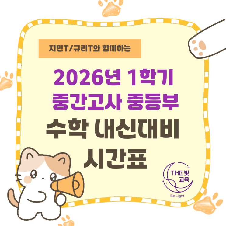 #더빛교육세레나학원 #중학교 #성암여자중학교 #신일중학교 #수학 #시간표 안녕하세요! 탄탄한 기본기부터 심화까지! 중학생 수학 학습 전문학원 더빛교육 세레나학원입니다! 2026년의 첫 시험! 1학기 중간고사가 다가오고 있습니다. 중간고사에서 좋은 성적을 받기 위한 중등부 수학 학습 시간표 안내드립니다. 귀엽고 예쁜 우리 중학생들의 수학은 이지민 선생님과 박규리 선생님께서담당합니다. 학생들의 문제 풀이를 꼼꼼하게 챙기며 실전에서 좋은 성적을 거둘 수 있게 최선을 다해 지도하고 있어요~ 중학교 2학년 학생들의 수학 시간은 화요일과 목요일 5시부터 8시까지입니다. 학습 진도와 과제, 오답 수정 등을 위한 개별 클리닉은 수요....... <img src="https://blogthumb.pstatic.net/MjAyNjAzMTJfMjQz/MDAxNzczMzE5NDg1MDgx.PEt2U4CL5NJjvQpXE4wB7dDNPyBCO9GQT5lF8Fpt48gg.9dcWlo0K4suqZK2IuEoFwf1umu-VBYWaEwC0SMvit9sg.PNG/6.png?type=s3" />