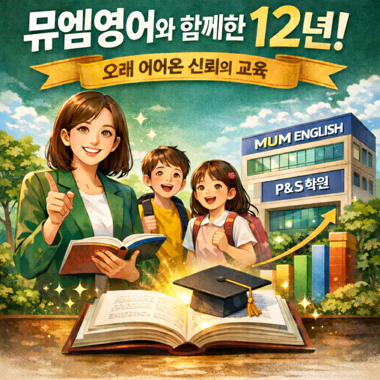 뮤엠영어가 출시된 지 어느덧 만 14년을 채웠습니다. 그리고 저희 피앤에스학원이 초등부에 뮤엠영어를 도입해 아이들과 함께해 온 시간도 벌써 12년이 되었습니다. 한두 해 반짝 도입하고 바꾸는 프로그램이 아니라, 긴 시간 같은 방향으로 걸어올 수 있었다는 사실은 저희에게도 의미가 깊습니다. 영어 교육은 단기간의 유행으로 성과가 만들어지지 않습니다. 특히 초등 영어는 더욱 그렇습니다. 눈앞의 점수보다 중요한 것은 아이가 영어를 어떻게 받아들이고, 어떤 방식으로 사고하게 되는지입니다. 피앤에스학원이 12년 동안 초등부 뮤엠영어를 유지해온 이유도 바로 그 지점에 있습니다. 시간이 증명한 결과, 그리고 학부모님의 신뢰 오랜....... <img src="https://blogthumb.pstatic.net/MjAyNjAxMzBfMjcy/MDAxNzY5NzM3NTg0MDMz.agWiRlO9RPcOb-yR6k8KhTU6YQpGaiEgxYzxiXQ_0cIg.uzYJEA1nmQ28IWmTj8rpcUhGxf4vO9-XXdOhPEwGNVsg.PNG/%B9%C2%BF%A5%BF%B5%BE%EE%BF%CD_%C7%D4%B2%B2%C7%D1_12%B3%E2.png?type=s3" />