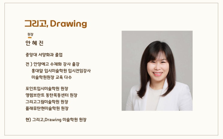 안녕하세요. 그리고,드로잉 미술학원 원장 안혜진입니다. 미술 교육의 홍수 속에서 어떤 학원을 선택해야 할지 고민이 많으실 줄 압니다. 저는 대학에서 서양화를 전공하고, 예고 강사와 홍대 앞 입시미술 전임강사를 거치며 수많은 아이들의 눈빛을 마주해 왔습니다. 입시라는 치열한 현장부터 프리미엄 아동 미술 교육까지, 쉼 없이 달려오며 제가 내린 결론입니다. "미술 교육은 단순히 하얀 종이를 채우는 기술이 아니라, 아이의 내면을 단단하게 빚어가는 과정이어야 한다" 30년의 경력이 증명하는 전문성 안양예고에서 수채화를 가르치고, 입시 미술의 메카인 홍대 앞에서 전임강사로 활동하며 저는 아이들이 가진 개개인의 ....... <img src="https://blogthumb.pstatic.net/MjAyNjAyMDlfMTU3/MDAxNzcwNjQwNjIzNDM4.oC6WaVTrE3Z93D_o1fHHnUZhgCgNIzo58g2u9H9xYWMg.qxS63aRHY5uW6h1qWDuwOqtC1zkDPpzp0CxBvG3s6wcg.JPEG/%C7%C1%B7%CE%C7%CA_%BB%E7%BA%BB.jpg?type=s3" />