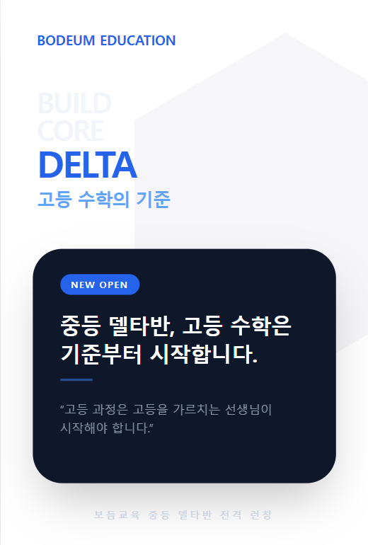 중등 델타반 OPEN 보듬교육의 고등 내신반은 Build · Core · Delta 수준별 분반으로 운영되고 있습니다. 그 중 가장 높은 단계의 이름을 그대로 가져와, 중학생을 위한 고등 과정 예습반 '중등 델타반'을 새롭게 시작합니다. 중등 델타반은 단순 예습을 위한 반이 아닙니다. 고등 내신과 수능을 실제로 지도하는 선생님들이 직접 수업을 진행하며, 고등 과정에서 필요한 사고 기준을 중학생 시기부터 만들어가는 수업입니다. ✔ 고등 내신·수능 담당 선생님이 직접 지도 ✔ 공통수학1부터 시작하는 체계적인 예습 ✔ 내신 기간에는 2~3주 집중 내신 대비 운영 ✔ 중등부터 고등까지 이어지는 학습 흐름 고등 과정은 결국 고등 수....... <img src="https://blogthumb.pstatic.net/MjAyNjAyMjZfMTMx/MDAxNzcyMDcyNDQyODA0.1QBxVXHEc6d-IrncEYIjLyS8PywVckdwmBmJJxxBqgkg.KETmoaAnqRlTzCZlvQHRhWec0x29CtRpHWW5CRb0KDog.PNG/image.png?type=s3" />