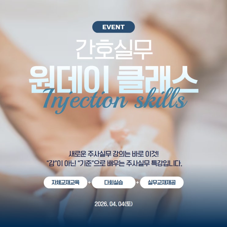 2026. 04. 04(토) “감(感)”이 아니라 **‘기준’**으로 배우는 주사실무 특강입니다. 주사는 손기술만으로 늘지 않아요. **왜 그렇게 하는지(이론)**를 정확히 이해하면, 실습은 훨씬 빠르고 정확하게 따라옵니다. 간호실무 원데이 클래스|Injection Skills|2026.04.04(토) 이런 분들께 추천해요 주사가 막연하고 자신감이 부족한 분 취업 전 IM/IV 핵심을 한 번에 정리하고 싶은 분 경력 공백 후 복귀 준비로 기본 술기를 다시 잡고 싶은 분 “해봤다”보다 “안전하게, 정확하게”를 목표로 하는 분 수업 특징(장현간호학원 주사실무는 이렇게 진행돼요) ✅ 자세한 교재 교육: 순서·포인트·실수하기 쉬운 부분까지 꼼꼼히 ✅ 다회 실습: 보....... <img src="https://blogthumb.pstatic.net/MjAyNjAzMDFfMjIw/MDAxNzcyMzM2MTQ0MTYw.g8Oq67fqtD2um-WIwkV4FLagmFbzbUqhjWZNy0x4Qk0g.rYu-A6YhOjO1ub5TnrWdlK_fqQduC8aKixDPfaeXkQ0g.JPEG/%C0%CE%BD%BA%C5%B8_%C1%D6%BB%E7%BD%C7%B9%AB%BE%C8%B3%BB20260404_01.jpg?type=s3" />