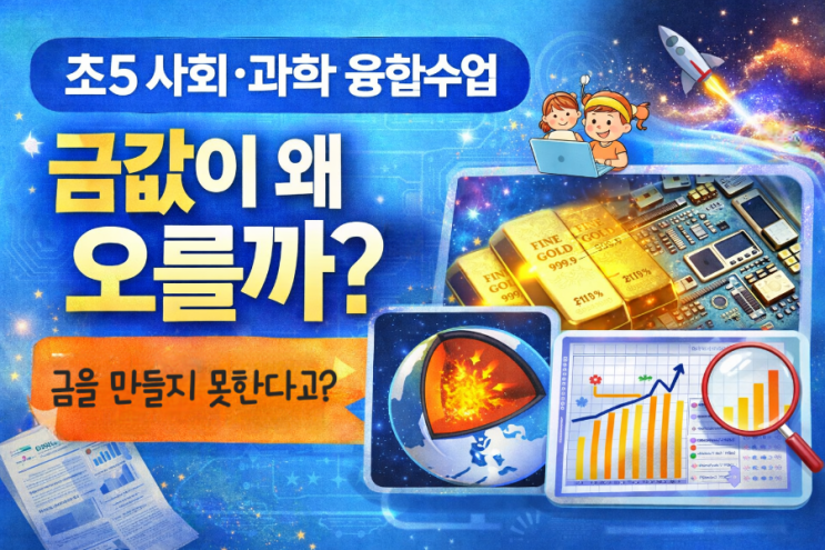 안녕하세요:) 다산동에서 초등 시사논술 수업으로 세상을 읽고 생각하는 힘을 기르는 글자람입니다. 최근 뉴스에서 금값이 연일 최고치를 기록하고 있다는 소식을 많이 접하셨을 텐데요. 이번 초등 5학년 수업에서는 교과서 속 ‘금’ 주제를 바탕으로 사회·과학·경제 개념을 함께 연결하는 논술 수업을 진행했답니다. 초5 자람이들과 함께 도대체 금이 무엇이길래 이렇게 비싸지는지, 그리고 왜 인류는 금을 직접 만들 수 없는지 그 흥미로운 비밀을 과학적·경제적 시선으로 탐구해 보았어요. 수업의 시작은 자람이들이 가장 궁금해하는 '경제 원리'였어요. 금값이 최근 60% 이상 폭등한 이유를 본문 내용을 통해 분석해 보았지요. 자....... <img src="https://blogthumb.pstatic.net/MjAyNjAyMjZfMTM5/MDAxNzcyMTEyMjU5MzIw.4xBavshhUfdbUAzWljyBfONxHrmLotLd-PgjuPKNX_wg.hKcHlRxEwgLwdmA9ZkzTtSIV-s2QAHJJID3eu21L3PUg.PNG/900%A3%DFfile%A3%DF000000000ba07208ab3ec14dbe62375f.png?type=s3" />