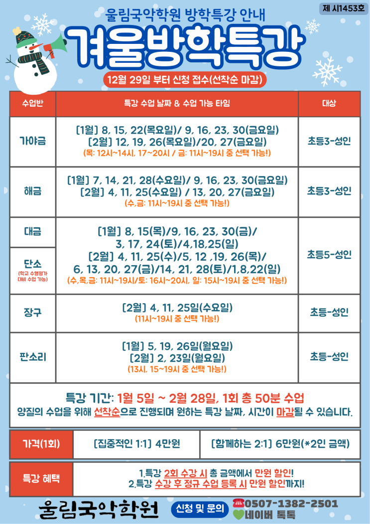 울림국악학원 겨울방학 특강 이벤트(1~2월)