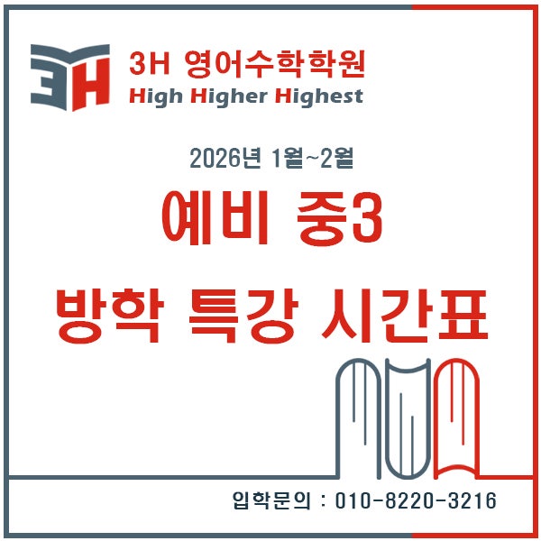 안녕하세요. 배곧 맞춤형 교육을 실천하는 3H영어수학학원입니다. 배곧고등학교 맞은편, 다이소 뒷 건물 현대프라자 2층, 3층에 자리잡고 있습니다. 이번 방학기간(1월 19일 월 ~ 2월 12일 목)동안 예비 중3 학생들을 위한 국어, 역사, 과학, 특강이 진행됩니다. 우선 방학기간(1월 14일 수~ 2월 26일 목)동안 자기주도학습 시간이 늘어납니다. 학생들은 4시 30분~5시 30분까지 1시간동안 문제풀이 및 단어암기를 수행하고, 5시 30분~7시까지 정규 수업을 수강합니다. 이후 7시~8시 30분까지 국어, 역사, 과학 특강이 약 4주간 진행됩니다. 수업 시간표는 아래와 같습니다. 특강은 재원생들에게 무료로 제공됩니다^^ 3H영어수학학원의 장점 ㄴ 1........ <img src="https://blogthumb.pstatic.net/MjAyNjAxMDJfMTc2/MDAxNzY3MzQ2Mjg3NjU0.e6TyzRoJdGr-JVyCRMsST7gncUXcZbHghZGhVc0H7SQg.Fhg1Z7M9BjQM83qTBsqO2l3KSns-sRV58id3M74Y4yYg.JPEG/%BF%B9%BA%F1%C1%DF3_%B9%E6%C7%D0%C6%AF%B0%AD.jpg?type=s3" />