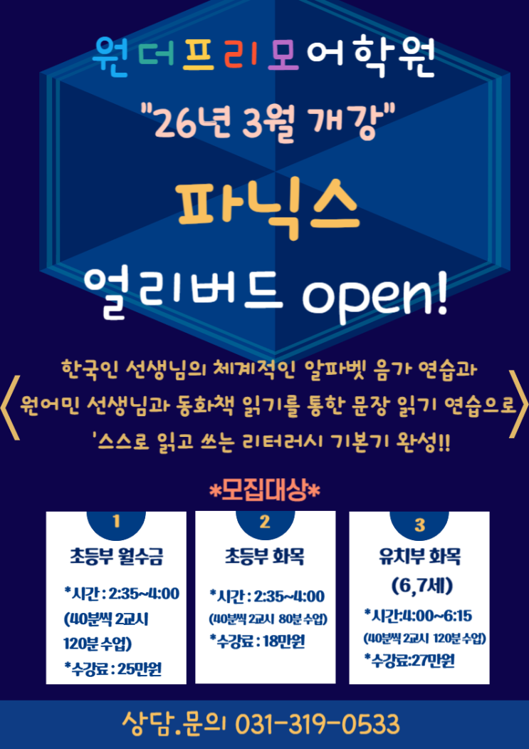 배곧영어학원 원더프리모어학원 초등 저학년 파닉스반 모집 안내 안녕하세요 원더프리모어학원 입니다. 우리 아이들~ 겨울방학이 시작되고 새학기가 다가올텐데요. 많은 학부모님들께서 영어 시작 시기에 대해 고민하시지만, 영어는 ‘언제 시작하느냐’보다 ‘어떻게 시작하느냐’가 훨씬 중요합니다. “영어는 아직 이르지 않을까요?” “알파벳부터 제대로 해야 하나요?” 특히 파닉스는 영어의 기초 중의 기초로, 처음 방향을 잘 잡아주지 않으면 이후 읽기·쓰기·말하기까지 모두 흔들릴 수 있습니다. 그래서 원더프리모어학원에서는 가정의 교육비 부담을 덜어들이고 영어 실력은 올려줄 수 있도록 1~2월에 등록하는 신입생들에게 특별한 혜....... <img src="https://blogthumb.pstatic.net/MjAyNjAxMDdfMjM5/MDAxNzY3NzY3NzgzODU3.kh8s_R7gpRUa93r3oc2rY71c0oDN1dxEFO1HrAvDKkog.uGdc_ClI7aSQFNiX-CmQPk7R87iZDwxKeC5y0Srip7cg.PNG/3%BF%F9%B0%B3%B0%AD%C6%C4%B4%D0%BD%BA.png?type=s3" />