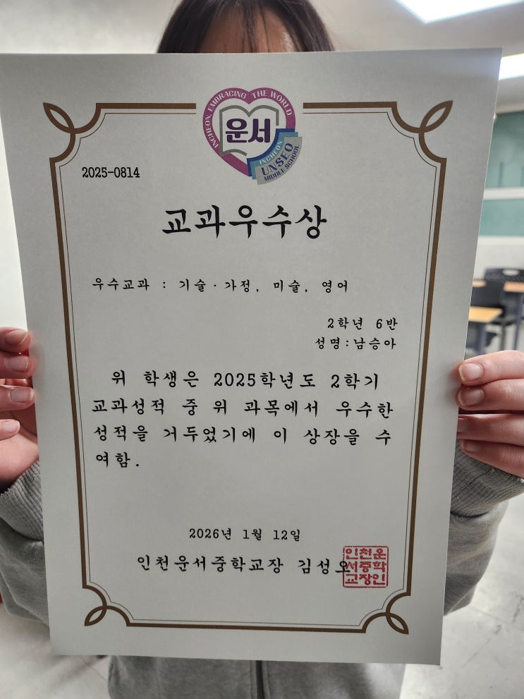 영어 교과우수상 블로그에 자랑해달라는 남승아 학생!