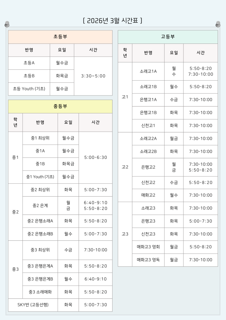 [유스영어학원] 2026 3월~ 시간표