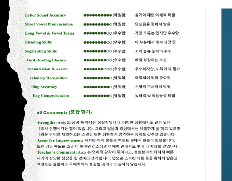 오늘은 우리 학원에서 진행한 <영어회화 및 파닉스 종합 평가> 결과를 보내는 날입니다. 부모님들 중에 많은 분들이 “시험 봤어요?”라고 물으시는데, 사실 저희에게 이 평가는 시험이라기보다 “아이의 현재 위치를 정확하게 보여주는 지도(map)”에 가깝다로 말할 수 있습니다. 왜냐하면, 점수를 매기는 것이 목적이 아니라, 지금 어디까지 와 있는지를 확인하는 과정이라고 생각하기 때문입니다. 파닉스 과정에 속해있는 학생들을 위한 평가서를 보시면 아시겠지만, 발음, 음가 이해, 블렌딩, 세그먼팅, 어휘, 스펠링, 독해까지 꽤 집요(?)하게 나눠서 평가합니다. 이유는 단순합니다. 영어는 한 가지 잘한다고 되는 과목이 아니기 때....... <img src="https://blogthumb.pstatic.net/MjAyNjAzMThfMTQg/MDAxNzczNzkzNzA5MzU4.pvrPtgJtJ4iD8rIPGPXZcyCK4g4oeTetBEMvuf1ce20g.HuujEanf0OlegTtnaj0C37N8yPJMxiquxG6Mg9-ZSb0g.PNG/image.png?type=s3" />