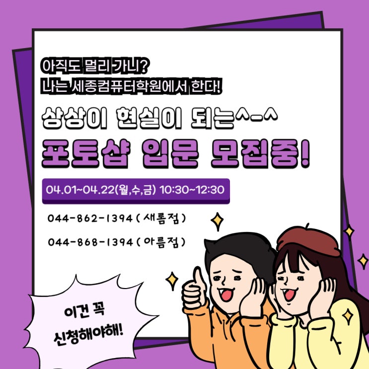 안녕하세요~ 세종컴퓨터학원입니다. 머릿속에 있는 디자인을 현실로 구현할 수 있는 포토샵 입문과정 개강합니다! 4월 첫 주 소수그룹 지도로 선착순 두 명 마감됩니다^^ 예전에는 세종시에 마땅히 그래픽 디자인 과정을 배울 곳이 마땅치 않아 대전이나 청주까지 멀리 나가셔서 번거로우셨죠? 실무 경력을 겸비한 전문 그래픽 디자인 강사를 보유하고 있는 세종 컴퓨터학원에서 기초를 탄탄히 다지고 실무에 활용 가능한 디자인 작업을 배울 수 있습니다. 더 나아가 GTQ 1급 자격증까지 취득한다면 다양한 직군으로 취업의 폭을 넓힐 수 있고 재택근무도 가능해 시간과 장소에 구애받지 않고 프리랜서로 활동도 가능합니다~ 이미지나 사진 보정....... <img src="https://blogthumb.pstatic.net/MjAyNjAzMThfNCAg/MDAxNzczODAwNDA0NzQz.GPy6Bd2w7rXWvH_e_ZAhAHPrBkqUdVqawg9p8Xzsb7wg.B8lLfE8uiwA9LZUNH2StmxYxQXVHy7oSN4iXIXUELf4g.JPEG/%C1%A6%B8%F1%C0%BB_%C0%D4%B7%C2%C7%D8%C1%D6%BC%BC%BF%E4_-001_%2836%29.jpg?type=s3" />
