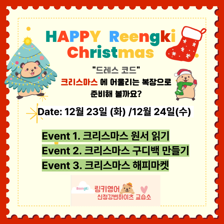 안녕하세요 :) Alice 샘입니다 우리 친구들이 너무나도 기다린 Christmas Market Day 다양한 이벤트와 함께 합니다 :) 그동안 모아온 코인으로 친구들이 원하는 것들을 사보는 특별한 경험을 하는 날 입니다. 다양한 이벤트로 친구들과 즐~~~겁게 보낼 예정입니다! 집에 안간다고 할지도 모릅니다 https://blog.naver.com/reengki_hitz_alice/224111744675 링키영어 수업이 궁금하신가요? 체험 수업 신청받고 있습니다 ↓↓↓↓↓↓↓↓↓↓↓↓↓↓↓↓↓↓↓ 네이버 폼을 통해 신청서를 작성해주셔야 체험 수업 신청완료됩니다 ^^ 문의 사항은 네이버 톡톡 또는 상담문의 문자로 남겨주시면 연락드리겠습니다 :) <img src="https://blogthumb.pstatic.net/MjAyNTEyMjJfMjI0/MDAxNzY2Mzk3MDM1NjQw.2hKe-H_i-Q6jbFHY89IywPozB72pOfTXlAXiDg3aCVgg.XxiJXJ0GYYypiESGd3CkMaucj6lYxy8hs33GF6Kp-KUg.PNG/2.png?type=s3" />