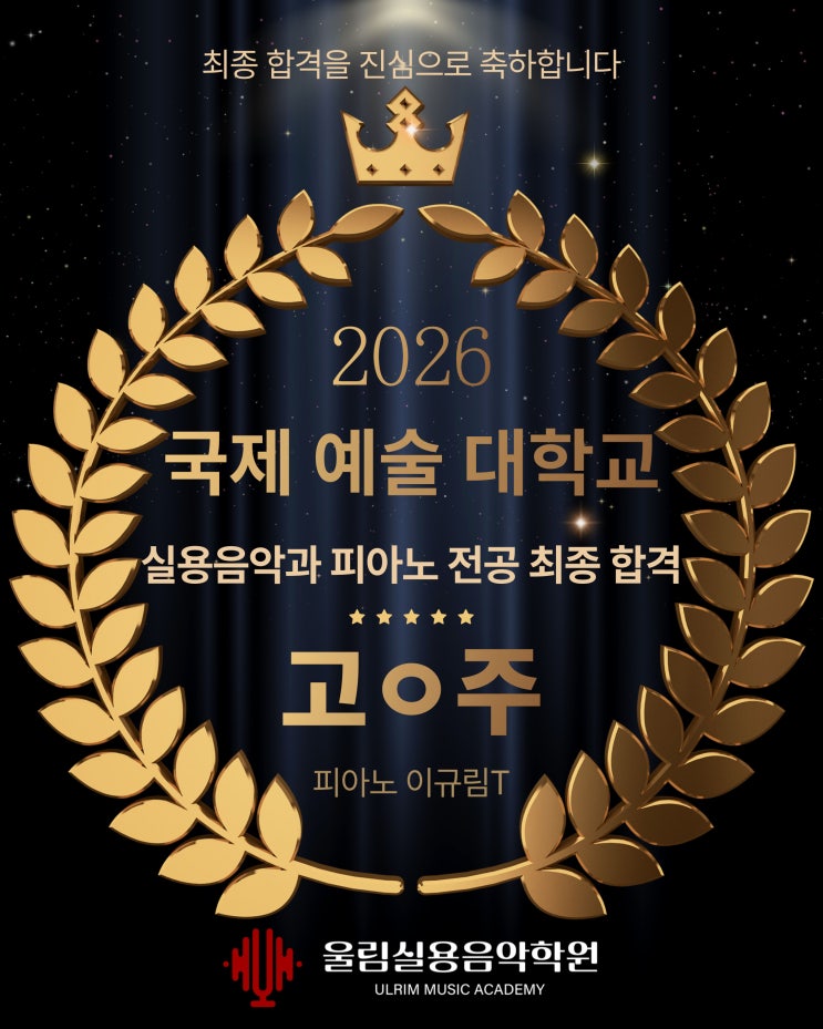 안녕하세요. 은평구 울림실용음악학원입니다. 2026학년도 실용음악과 입시에서 국제예술대학교 실용음악과에 합격한 학생의 기쁜 소식을 전해드립니다. 입시 결과가 발표되는 순간은 항상 설레면서도 긴장되는 시간이지만, 학생이 준비해온 과정을 함께 지켜본 입장에서는 그 노력의 시간이 떠올라 더욱 의미 있게 느껴집니다. 어렸을때부터 음악을 해야 전공을 할 수 있나요? 꼭 그런것은 아닙니다. 물론 어린 시절부터 음악을 접했다면 조금 더 빠르게 결과를 만들어갈 수는 있습니다. 하지만 울림만의 전략적인 입시 준비 시스템과 입시 경력 최소 7년 이상의 전문 강사진이 함께하기 때문에 현재의 출발선이 어디에 있든 학생의 속도에 맞는....... <img src="https://blogthumb.pstatic.net/MjAyNjAzMTdfMjUg/MDAxNzczNzI1NDQ3ODEz.xOGknjJ7gLG9QQQzaPlBwRtDOTmmDfGNg5syn2ZtRyQg.WOOgJdKlRV99v-Vfz27F9AxdfcfdMh110uhV-afyUP4g.JPEG/9.jpg?type=s3" />