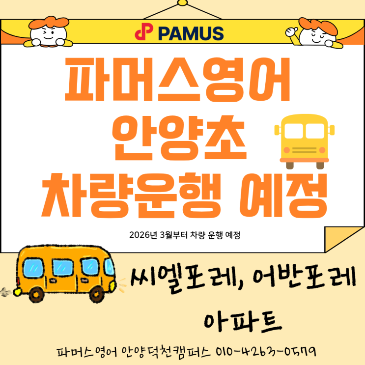 안녕하세요, 파머스어학원 안양덕천캠퍼스입니다. 차량운행 안내사항입니다. 파머스영어 안양초 차량 운행 안내 ✔ 운행 시작일 2026년 3월부터 차량 운행 예정 ✔ 운행 지역 안양 씨엘포레 아파트 안양 어반포레 아파트 안양역 푸르지오 아파트 영어의 첫 시작부터 꾸준한 실력 향상까지 파머스영어가 함께합니다 . 상담 및 문의 차량 운행, 수업 일정, 레벨 테스트 등 궁금한 점은 언제든지 편하게 문의 주세요. 파머스영어 안양덕천캠퍼스 ☎ 010-4263-0579 네이버톡톡 https://naver.me/ID3NLocI #파머스영어 #파머스어학원 #파머스영어안양덕천캠퍼스 #안양초영어학원 #안양어학원 #안양초 #안양초어학원 #안양영어학원 #안....... <img src="https://blogthumb.pstatic.net/MjAyNjAxMDRfMjU0/MDAxNzY3NTAwMzQxODU0.eryco2fK4Yvy-QmJ03HIwfKymsTLu0inwfDmiLF74oIg.Nt01E7TkIRBPKQne1YWl8F_yqEBoFxXwOgo54LHgIxgg.PNG/%C2%F7%B7%AE%BF%EE%C7%E0%BF%B9%C1%A4_%287%29.png?type=s3" />