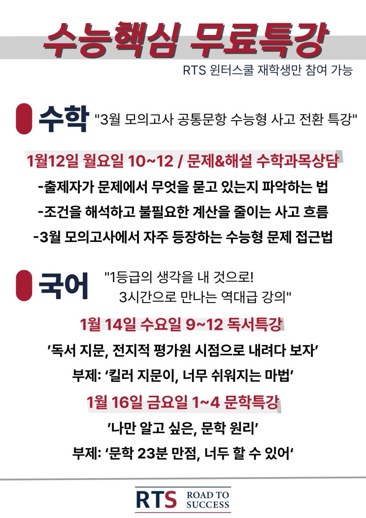 RTS 윈터스쿨, 첫 번째 이벤트 수능 핵심 무료특강 진행 윈터스쿨이 한창 진행 중인 RTS학원에서 **첫 번째 특별 이벤트, ‘수능 핵심 무료특강’** 을 진행합니다. RTS의 윈터스쿨은 단순히 시간을 채우는 방학 수업이 아니라 수능을 기준으로 사고방식부터 다시 만드는 과정입니다. 그래서 이번 무료특강 역시 ‘체험용 수업’이 아닌 RTS 수업의 핵심만을 압축한 시간으로 준비했습니다. 국어 상위권으로 가기 위해 반드시 알아야 할 핵심 국어는 문제를 많이 푼다고 실력이 오르지 않습니다. 특히 상위권으로 갈수록 지문을 어떻게 바라보는가, 출제자의 시선을 어떻게 읽어내는가 가 성적을 가릅니다. 이번 국어 특강에서는 독서 지문....... <img src="https://blogthumb.pstatic.net/MjAyNjAxMDhfMjI3/MDAxNzY3ODczMDI2MTg5.n5q0hfEdnTsAaA6DBx58PVP2QHzgXL_eoV5z9ovB3xog.lYJyWQCDU6H_I3TVVeJx3JVhj_uwuX1DztdMIh7aSPgg.JPEG/%C1%A6%B8%F1%C0%BB-%C0%D4%B7%C2%C7%D8%C1%D6%BC%BC%BF%E4_-002.jpg?type=s3" />