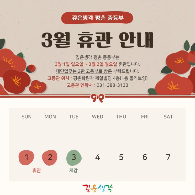 안녕하세요. 깊은생각 평촌 중등부입니다. 3월 휴강일 안내드립니다. 휴강일 : 3월 1일 (월) ~ 3월 2일 (월) 개강일 : 3월 3일 (화) ~ 해당 날짜의 수업은 전체 휴강 진행되며, 1관 데스크 휴무입니다. *보강 등 특이사항이 있는 반은 담당 선생님께서 개별공지 드립니다* *대면 및 전화 업무는 2관 고등관으로 문의 부탁드립니다* ☆고등관 연락처 : 031-388-3133 ☆고등관 위치 : 평촌학원가 제일빌딩 4층 (1층 올리브영 건물) 즐거운 새학기 준비 잘 하고 건강하게 다시 만나요! <img src="https://blogthumb.pstatic.net/MjAyNjAyMjZfMjM2/MDAxNzcyMDg4MDk1NzE4.e0mr0fMFmARmG_6XmaGd2spRavOCRnvGRJe_hDWboG4g.D5UicDeJ48jKsVMrVdvemR2V2HJO4rda0lOtwU1b5Mgg.JPEG/3%BF%F92%C0%CF_%C8%DE%B0%AD_%C0%CC%B9%CC%C1%F6.jpg?type=s3" />
