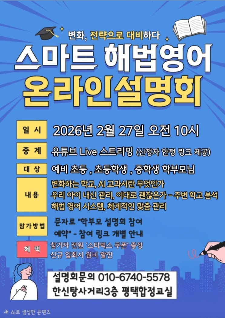 안녕하세요. 평택 합정동 스마트 해법영어입니다. 요즘 학부모님들께서 가장 많이 하시는 질문이 있습니다. “AI 교과서가 도입된다는데, 우리 아이는 어떻게 준비해야 할까요?” “중학교 내신, 지금 방식으로 계속 괜찮을까요?” 빠르게 변화하는 교육 환경 속에서 막연한 불안이 아닌 정확한 정보와 전략이 필요한 시기입니다. 그래서 준비했습니다. 스마트 해법영어 온라인 설명회 2026년 2월 27일 오전 10시 유튜브 Live 진행 (신청자 한정 링크 제공) 대상 : 예비초 · 초등 · 중등 학부모님 집에서 편하게 시청하실 수 있도록 온라인으로 진행됩니다. 설명회 주요 내용 1️⃣ 변화하는 학교, AI 교과....... <img src="https://blogthumb.pstatic.net/MjAyNjAyMTRfMzYg/MDAxNzcxMDU3Mzc5Nzg3.PuHgY1kdpkViwli42riU38XNx47iSO9r0zefNhHc-1wg.PufJMVmy4Vn5fR55VRLI2Gf3inGawDgwrZN5ilU_lbgg.JPEG/900%A3%DFfile%A3%DF00000000529071fd9ad475b56994eb2b.jpg?type=s3" />