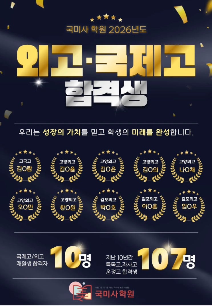 안녕하세요~ 저희 국미사 학원 재학생 중에 외고, 국제고에 합격한 학생들입니다. 모두 중등부 국어 수업을 중3 졸업 때까지 수강했던 학생들입니다. 특목고 합격은 끝이 아니라 출발선입니다. 더 높은 곳을 향해, 담대하게 시작하세요. 치열한 환경 속에서 여러분은 더욱 빛날 것입니다. 별처럼 빛나는 여러분의 미래를 응원합니다!!! <img src="https://blogthumb.pstatic.net/MjAyNjAzMDVfOCAg/MDAxNzcyNjQxNTk1MTI1.TK4vxaxGRZKuyQ7rIAKhz2T40vInmceqqgkGgx9f4pMg.rBhfdWWFZu2kFxBSBLQacvIGqWCKf85OVEN2FaLlBfgg.JPEG/IMG%A3%DF3972.jpg?type=s3" />