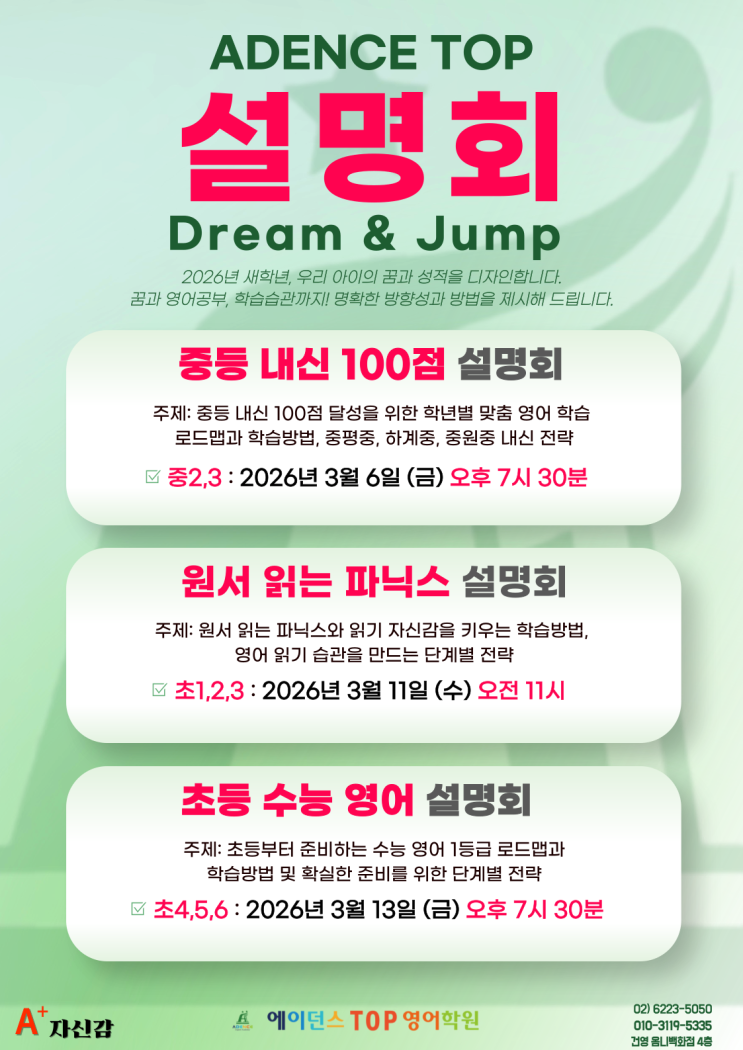안녕하세요! 15년 이상 내공으로 중계, 하계 지역 학생들 영어 성적을 고득점으로 이끌고 있는 에이던스TOP 영어학원입니다. 오늘은 에이던스TOP 영어학원의 2026 ADENCE TOP Dream & Jump 설명회에 대해서 안내드리겠습니다. 꿈은 크게, 성적은 확실하게. 우리 아이는 지금 ‘점프’할 준비가 되어 있나요? 2026년 새학년을 앞두고 많은 학부모님들께서 같은 고민을 하십니다. “지금 방향이 맞는 걸까요?” “수능까지 이어지는 영어 공부, 어떻게 준비해야 할까요?” 2026년, 영어는 학년마다 준비 방식이 달라집니다. 초등 저학년은 읽기 기반, 초등 고학년은 사고력 설계, 중등은 내신 전략 완성의 시기입니다. 이제는 단순 암기가 아니....... <img src="https://blogthumb.pstatic.net/MjAyNjAyMjNfMTQ1/MDAxNzcxODQ3Mzk5MTky.LOvWAAxLoMqLJsSkzD-1UejdsAvimk0a5PthJtdvi-4g.ApEBjKGGsW_Ne6QlTfAgquTH_8v5h6o0C4hcU_4bIoEg.PNG/%BF%A1%C0%CC%B4%F8%BD%BA-%BC%B3%B8%ED%C8%B8-%C6%F7%BD%BA%C5%CD-003_%283%29.png?type=s3" />