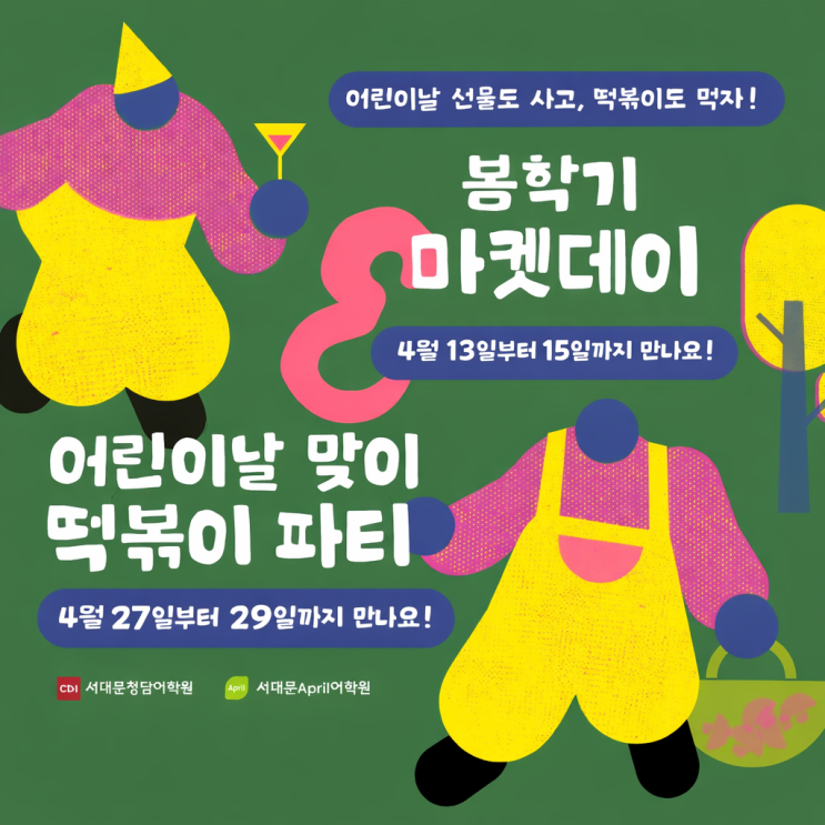 봄학기 마켓데이 & 어린이날 이벤트 안내 안녕하세요 서대문청담어학원 & 서대문 April어학원입니다! 따뜻한 봄바람과 함께 아이들이 가장 좋아하는 특별한 이벤트를 준비했어요 봄학기 마켓데이 OPEN! 아이들이 직접 참여하고 즐길 수 있는 즐거운 마켓데이가 열립니다! 일정 4월 13일(토) ~ 4월 15일(월) 어린이날을 맞아 작은 선물도 고르고, 친구들과 함께 즐거운 시간을 보낼 수 있는 기회! 아이들이 직접 참여하며 소소한 즐거움을 느낄 수 있는 특별한 시간이 될 거예요 어린이날 맞이 떡볶이 파티 그리고! 빠질 수 없는 인기 이벤트✨ 아이들이 가장 좋아하는 메뉴로 준비한 떡볶이 파....... <img src="https://blogthumb.pstatic.net/MjAyNjAzMjBfMTYz/MDAxNzczOTg5OTkwOTIy.Lc6j3K8PEU0GU2OYXQUbL0Hc1lSNQtlmOLvoqb5-jcUg.Fqr8qQ_Cewz7M5uP5zJL3JFN8Ghfs-BFlzPnwMDXkuwg.PNG/ChatGPT_Image_2026%B3%E2_3%BF%F9_11%C0%CF_%BF%C0%C8%C4_03_38_04.png?type=s3" />