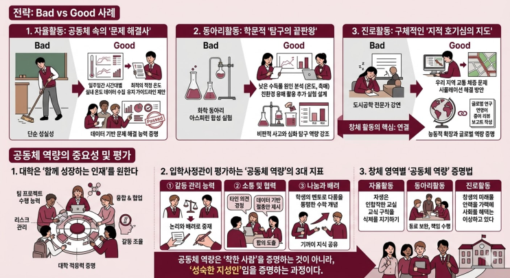 2026년 생기부 활동계획이 필요한 이유 생기부 진단 상담을 하면 고3 학생들도 대부분 모르는 부분이 창의적 체험활동을 이해하지 못합니다. 창의적 체험활동 : 학교에서 진행되는 다양한 활동에 참여하고, 그것에 연결해서 창의적인 활동을 하라는 것입니다. 설문조사, 포스터 그리고. 토론활동, 감사문 작성, 보고서 작성. 해다마 대학이 발행하는 학생부전형 가이드북에 불합격 사례에, 창의적 체험활동에서 참가, 배움. 다짐으로 끝난 창의적 체험활동을 지적 합니다. 1. 자율활동: 공동체 속의 '문제 해결사' 대학이 보고 싶은 모습: 단순한 학급 임원 경력이 아니다. 공동체의 문제를 스스로 발견하고, 이를 해결하기 위해 주도....... <img src="https://blogthumb.pstatic.net/MjAyNjAzMjBfMjE2/MDAxNzczOTU1Njk2ODI0.Ho7lEGf8S-3HFr3f5aprAXVqZ3CZNVSPauWq2ELoOzwg.Ddviqmfru-EHfueVkrKhVvRep8_cwQrAmWmG6_D4plUg.PNG/image.png?type=s3" />