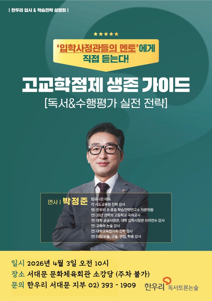안녕하세요? 꽃샘추위가 기승이네요. 감기 조심하시기 바랍니다. 오늘은 봄 학기 한우리 서대문 지부 행사를 소개하려고 합니다. 지난가을 학부모 설명회도 서대문구의 많은 어머니들께서 참석해 주셔서 유익한 설명회였다고 칭찬해 주셨는데요. 이번 설명회도 그런 칭찬을 받을 수 있을 것 같습니다!!! 바뀐 입시 제도 아래 아이들의 학습과 진로를 어떻게 도울 것인지 실질적인 가이드를 해주실 분을 모셨다고 합니다. 고교학점제는 무엇이고 그런 제도 아래 우리 아이들은 어떻게 진로 맵을 그려야 할지 방향 제시를 받으실 수 있습니다. 위 일시와 장소 참고하시고 많은 참여 부탁드립니다. 상담 문의> 010-2543-1909 독서교실 실장 김문....... <img src="https://blogthumb.pstatic.net/MjAyNjAzMjBfMjE2/MDAxNzczOTgwNjM5NTc5.ngadJelsDh689YTQ8KZNGKUlxCaH2NtUITBe1LYmgi0g.Uz4EeuMaPqi5G161tWRjWEvK8fMSoS0xvdTljdGzUfog.JPEG/%C7%D0%BA%CE%B8%F0%BC%B3%B8%ED%C8%B8.jpg?type=s3" />