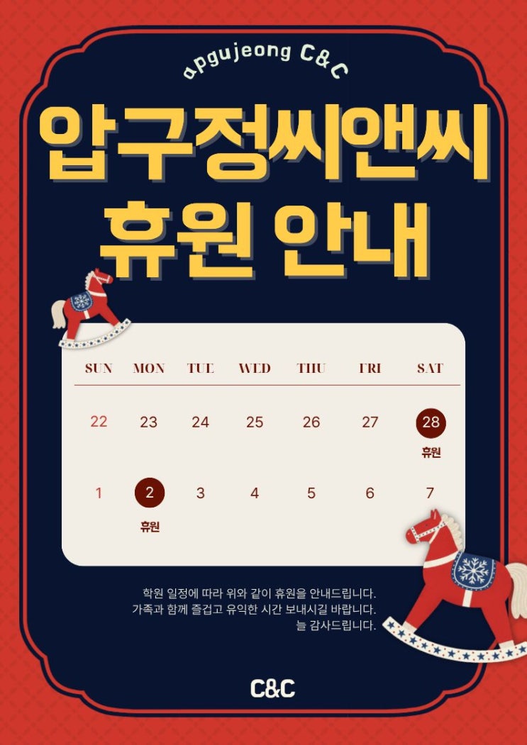 압구정씨앤씨미술학원 겨울특강 종료 및 대체공휴일 휴원 안내