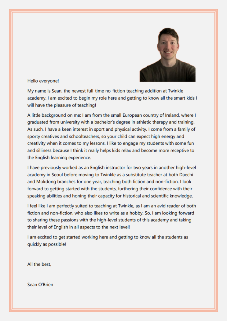 Sean O 선생님은 Non-fiction, 3/9(월)부터 트윈클 대치 본원에서 근무 중 입니다. <img src="https://blogthumb.pstatic.net/MjAyNjAyMjZfMjUy/MDAxNzcyMDg5Mzc0NDQ4.RAkHafyQCwYR35s7sMrkxtjzuiWhqtmn2vXdyqFNaIcg.Pm9DUXmXRXcF-P02n_iONX1CFrREkaVKFRaoebZoAvAg.PNG/Sean_O_%BC%B1%BB%FD%B4%D4_%BC%D2%B0%B3_1.png?type=s3" />
