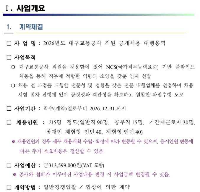 대구교통공사는 보통 4월에 필기시험을 치룬다. 또한 서류도 필기시험 합격자 대생으로 접수를 받기 때문에 원서 접수 후 바로 시험을 보는 특징이 있다. 아래는 2026년 사업계획 중 채용인원을 나타낸 것이다. 무슨 의미가 있냐 싶겠지만 다시 지역제한이 들어온 첫 해이기 때문이다. 총 215명 정도라고 예상을 하나 더 증가될 수도 있다. 작년공고로는 인턴과 기간제, 공무직 제외 일반직으로만 66명 채용하였다. 2026년에는 90명으로 채용 예상한다고 하니 증원된다고 보면 된다. 가장 결정적인 것은 지역제한이 작년에는 없었다. 서울이든 부산이든 응시할 수 있었다. 하지만 2026년부터는 다시 대구, 경북에 주민등록이 되어 있어야 한다. 2....... <img src="https://blogthumb.pstatic.net/MjAyNTEyMTlfMjM2/MDAxNzY2MDkyNzE3MDA5.8IWDq2J4Qr9ccuorSJcrETfqLVYcdul5C1BxJurctUQg.rFXbjFYbiey6ZQSjDqPiEbHwoPwVgvdbOoxWPgI7nKog.PNG/image.png?type=s3" />