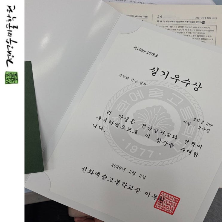선화예고 2학년 서양화과 실기우수상을 수상하였습니다. 고등학교에 가서도 열정이 그대로인 윤진아 수상 너무너무 축하해~~ <img src="https://blogthumb.pstatic.net/MjAyNjAyMjBfMjE1/MDAxNzcxNTY2MDA3NDk5.kOCHEsyBNPJIwpipkP7cRqfRIV_Dp4M0lOsYw1Bia_kg.fN8raqDPdH47QDjYGAZIvg0s_-Qo3yw4zc8iWNcZaLAg.JPEG/%BC%B1%C8%AD%BF%B9%B0%ED_%C1%A4%C0%B1%C1%F8.jpg?type=s3" />