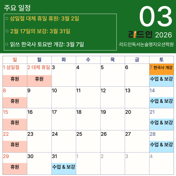 안녕하세요:) 폰보다 책을 좋아하는 아이들로 북적일 초•중등 독서와 글쓰기를 통한 자기주도학습 전문학원 리드인독서논술 명지오션학원 원코입니다. 봄과 함께 새 학년이 시작되는 3월, 아이들의 힘찬 출발을 응원합니다. ♡ 가정에도 따스한 봄기운이 가득하시길 바라며, 2026년 3월 안내사항 전달드립니다. 1️⃣ 3월, 4월 휴원일 안내 - 대체공휴일 : 3/2(월) 휴원 - 4월 5주차 : 4/29(수), 4/30(목) 휴원 2️⃣ 2/17(화)의 보강 안내 - 3/31(화)에 보강 3️⃣ 새학기 무료 체험 수업 및 교과도서지수 테스트 ✅️ 무료 체험 수업 - 대상 : 초등 1 ~ 2학년 ✅️ 무료 교과도서지수 테스트 (레벨 테스트) - 대상 : 초등 3 ~ 중등 ✅️ 사전....... <img src="https://blogthumb.pstatic.net/MjAyNjAyMjhfNjkg/MDAxNzcyMjYwNTU5OTAw.kpgMoOyh-8FZnQXITjM_jlMM0C6l5ChemDDHaj_0byIg.1I4A8b_CaUkupCOuSxw9n-xpKXrtR010bzUHXwV4DOEg.PNG/26%B3%E2_3%BF%F9_%C0%CF%C1%A4%C7%A5.png?type=s3" />