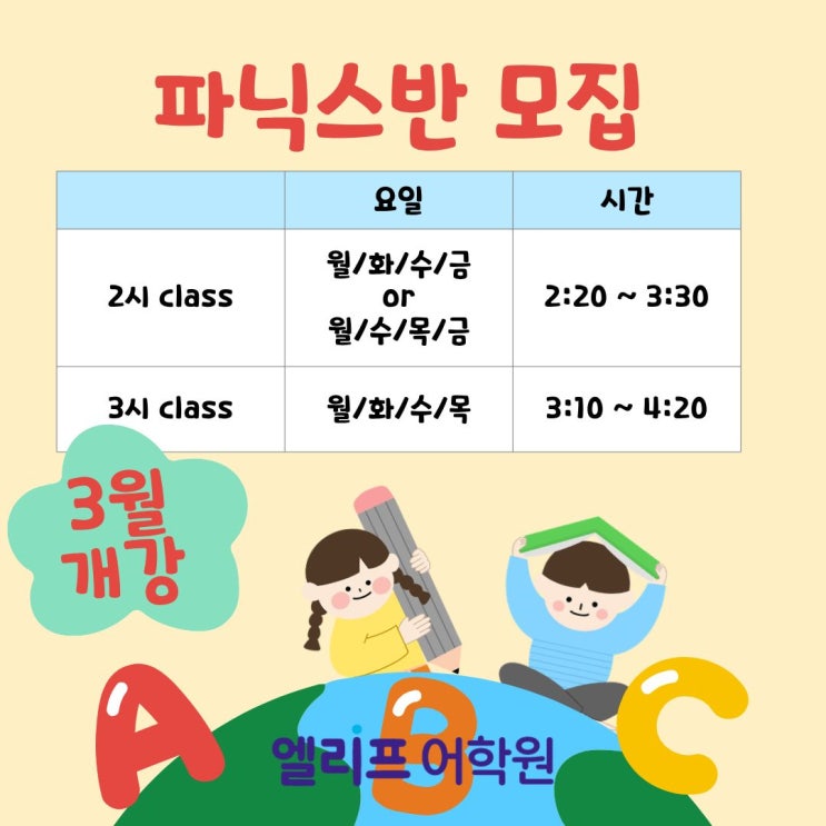 [영종도 영어학원] 엘리프영어 파닉스반 3월 중 개강!! 2시부, 3시부