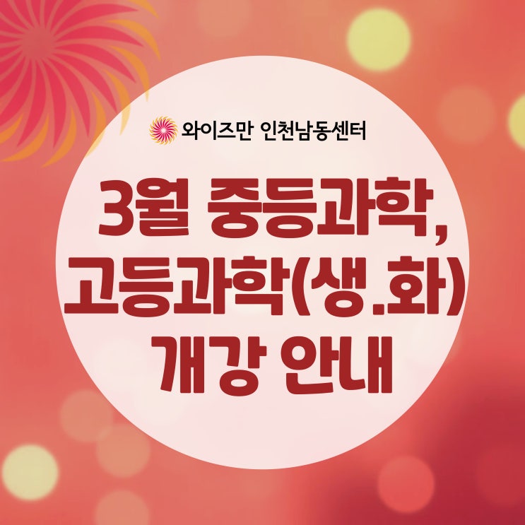 안녕하세요. 구월동 간석동 수학/과학학원 와이즈만 인천남동센터입니다. 혹시 아이가 "과학은 그냥 외우면 되는 거 아니야?" 라고 말하나요? 그게 가장 위험한 신호입니다. 중등 심화부터 고등 과학까지, 단순 암기로 버틸 수 있는 구간은 이미 끝났습니다. 와이즈만 인천남동센터 3월 신규 과학 개강반을 안내합니다! (3/5부터 3월 수업 시작!!) [중등 과학] 중학교 과학 성적이 A라고 안심하지 마세요. 진짜 실력은 '심화 문항'을 어떻게 해결하느냐에서 갈립니다. 토요일 12:00~13:50 (3/7 개강) 화요일 19:00~20:50 (3/10 개강) 수요일 19:00~20:50 (3/11 개강) (中 택 1) 중1 과정부터 시작합니다. [고등 화학1] 많은....... <img src="https://blogthumb.pstatic.net/MjAyNjAyMTBfMzkg/MDAxNzcwNzA5MDM5NTU4.FxgY_3qt_YU2XGGslyuj5OYxNk5f9qPjOyvJRq8yfnIg.Y6NPAuOp9pPHYSsGyE0bP9plT-H5qgkHwCldVo2j5LIg.JPEG/%C1%A6%B8%F1%C0%BB-%C0%D4%B7%C2%C7%D8%C1%D6%BC%BC%BF%E4_-016.jpg?type=s3" />