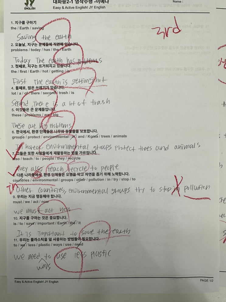지난번에 단어를 제공하고, 어순을 배열하는 연습을 한후, 가정에서 어플을 통해 또다시 어순배열 과제를 진행했다. 지난번 틀린 부분을 점검할 수 있도록 어순배열을 한번 더 진행한다. 지난번에 틀렸던 문장에서 다시 같은 실수가 반복되었다. 문장을 3번 다시 써보고, 이번에는 한글만 제공하고 영작을 해보도록 한다. 명사의 단복수 형태, to부정사의 올바른 쓰임, 동사의 수일치, 단어 스펠링의 실수가 있었다. 틀린 부분을 3번 더 쓰고 다음 시간에 다시 한번 영작을 해보도록 한다. <img src="https://blogthumb.pstatic.net/MjAyNjAzMjFfMjcy/MDAxNzc0MDg0ODE0NjE2.3_z4VAdX8bC0NEHQLfAcofrq_k0aEwN-HtRgDS4BDxog.YNEzh5Nz4YWEy1OU7c7GuvHKHYhU-9Q4khj4eq6TxXQg.JPEG/KakaoTalk_20260321_181732150.jpg?type=s3" />