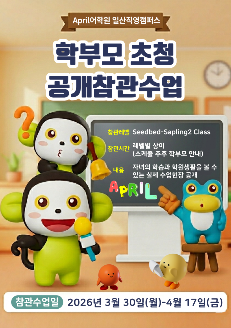 지난 학기에 이어 이번 봄학기에도 학부모님을 초청하여 참관수업을 진행합니다. 일산직영캠퍼스의 실제 수업을 참관하며 담당 강사님과 우리 친구들의 상호작용을 그리고 학원 생활모습까지 한 눈에 보실 수 있습니다! ※ 공개참관 수업 중요한 이유 ※ 영어로 소통하는 모습을 볼 수 있다 영어로 말하고 듣는 모습을 볼 수 있다 영어로 직접 쓰고 발표하는 모습을 볼 수 있다 (일부 레벨에 한정) 우리 아이들의 생각과 감정 그리고 의견들을 라이팅과 스피킹으로 표현하는 모습을 직접 확인하실 수 있습니다. 매일 매일 성장하고 발전하는 우리 친구들의 성장기에 부모님께서 특별한 현장의 자리에서 함께 느껴주시면 좋겠습니다. <학부모 참....... <img src="https://blogthumb.pstatic.net/MjAyNjAzMjNfMTAw/MDAxNzc0MjQyMjE3NTE4.kWoV93DlqUi-Dx4VHXH99INzRfBnaYMGgk9bDsbK5gMg.oDLP0CDjln87AIPgqjfEfkm7srF7tyQqWQjsBPWQ6rQg.PNG/%C2%FC%B0%FC%BC%F6%BE%F7_%B0%F8%B0%B3%C6%F7%BD%BA%C5%CD.png?type=s3" />