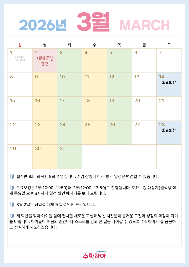 효성수학 장아쌤 3월 수업 안내