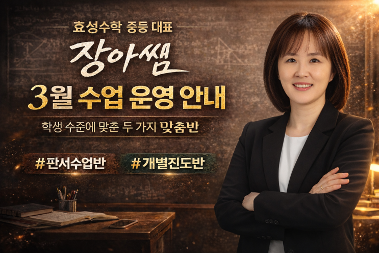 효성수학 중등 대표 장아쌤 3월 수업 운영 안내 중등은 빠르게 가는 것이 아니라 단단하게 가는 것입니다. 3월부터 장아쌤 수업반은 학생의 진도와 실력에 따라 판서수업반 / 개별진도반으로 나누어 운영됩니다. 중등 시기에 수학의 뼈대를 제대로 잡지 않으면 고등에서 흔들립니다. 1️⃣ 판서수업반 (구조 중심 수업) 개념을 정확히 이해하고 문제 적용 능력을 체계적으로 훈련하는 반입니다. ▪ 3-1 문풀반 요일 : 월 / 금 교재 : 라이트쎈 3-1 6:30 ~ 8:30 과제 오답 + 클리닉 + 테스트 8:30 ~ 10:00 진도 수업 ▪ 공수1 문풀반 요일 : 화 / 토 교재 : 라이트쎈 공수1 (화) 6:30 ~ 8:30 → 오답 · 클리닉 · 테스트 8:30 ~ 10:....... <img src="https://blogthumb.pstatic.net/MjAyNjAyMjVfNCAg/MDAxNzcxOTk0MjYwMDI0.pSyV_OQQrOAwAGoW6hK5eGikFR2HTQ3sqC7FXpUUpREg.SN3GHwPc4NvP-OurwQgB_SYpr5kylTukrMM3J3AxoCog.PNG/ChatGPT_Image_2026%B3%E2_2%BF%F9_25%C0%CF_%BF%C0%C8%C4_01_36_44.png?type=s3" />