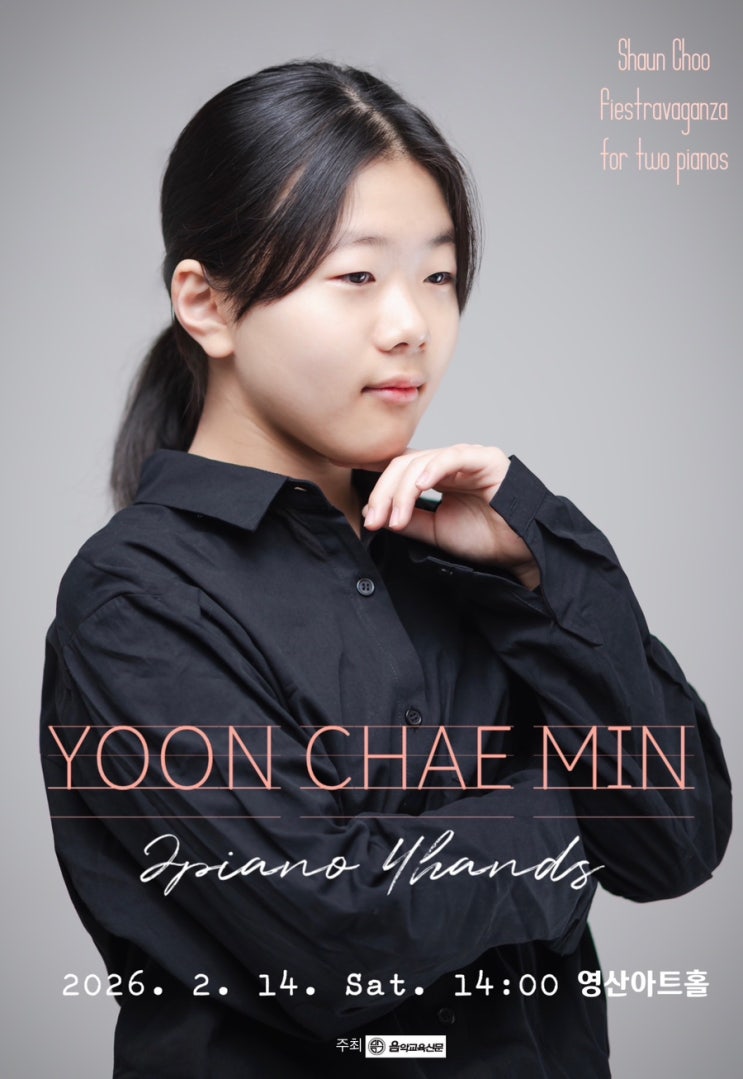 2026년 제자와 함께하는 서울연주 2Pianos 4Hands 채민양과 함께 하게되었습니다:) 곡은 싱가포르의 유명한 피아니스트 Shaun Choo(숀추) ‘Fiestravaganza(피에스트라바간짜)’ 입니다. 1st. 윤채민 / 2nd. 전다은 실력과 음악성을 더 다듬고 감동과 감격의 무대를 만들고 오도록하겠습니다 일시 : 2026. 02. 14. 토 오후2시 장소 : 여의도 영산아트홀 <img src="https://blogthumb.pstatic.net/MjAyNjAxMjRfMTU4/MDAxNzY5MjM3NTM2NzQx.L74P5mrbiU2wAjWzD_RyPhokekOvJqxw8CvzK0S2jXkg.wysbhRWPxvRjfZt3pVhj6OrQFBhdPQScCATiAHo5BREg.JPEG/IMG%A3%DF6918.JPG?type=s3" />