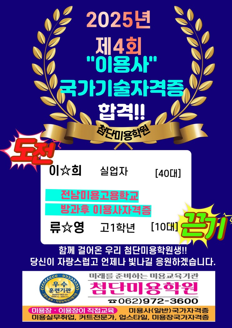 ♥찐![첨단미용학원]★2025년 제4회 이용사 실기 합격★