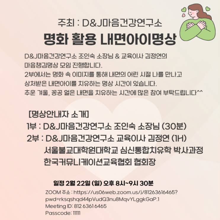 무료명상초대 _명화 활용 내면아이명상 명상안내자김정연 명화 활용 내면아이명상 D&J마음건강연구소 조인숙 소장님 & 교육이사 김정연의 마음챙김명상 모임 진행합니다. 2부에서는 명화 속 이미지를 통해 내면의 어린 시절 나를 만나고 상처받은 내면아이를 치유하는 명상 시간이 있습니다. 추운 겨울, 꽁공 얼은 내면을 치유하는 시간에 많은 참여 부탁드립니다^^ 주최 : D&J마음건강연구소 일정 : 2월 22일 (일) 오후 8시~9시 30분 [명상안내자 소개] 1부 : D&J마음건강연구소 조인숙 소장님 (30분)_마음챙김명상 2부 : D&J마음건강연구소 교육이사 김정연 (1H)_ 명화 활용 내면아이명상 서울불교대학원대학교 심신통합치....... <img src="https://blogthumb.pstatic.net/MjAyNjAyMTRfMjA3/MDAxNzcxMDI4ODUzNTAz.6AAPMmzxLUrKhGwIA1bd5AbRmcUK29Me-5qFpwDSgTsg.1ctSjCa-gZTF9Ez7EKtEZANTP0xlHicspFcBlcZXvrkg.PNG/900%A3%DF%C1%A6%B8%F1%C0%BB%A3%DF%C0%D4%B7%C2%C7%D8%C1%D6%BC%BC%BF%E4.%A3%A81%A3%A9.png?type=s3" />