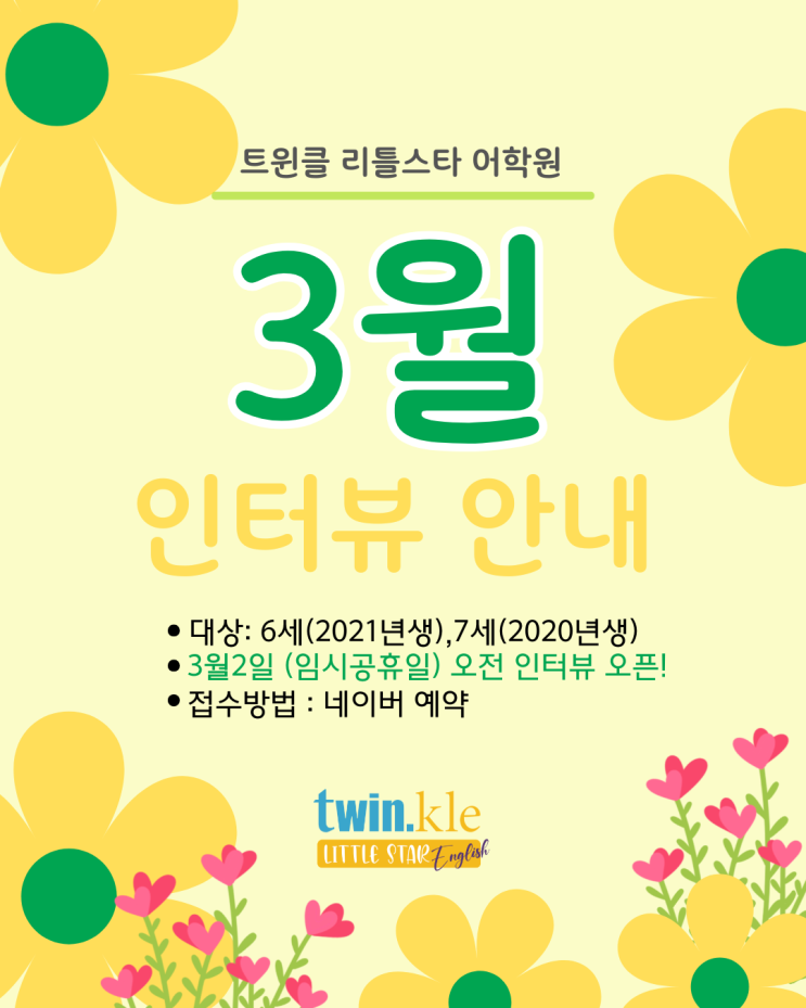 학부모님 안녕하세요~! 트윈클 리틀스타 어학원입니다. 설렘 가득한 봄의 시작, 3월입니다. 새로운 걸음을 내딛기 딱 좋은 시기이지요 트윈클 리틀스타 어학원의 3월 인터뷰를 안내해 드립니다. 3월 2일(임시 공휴일)은 오전 인터뷰가 추가로 운영됩니다. 자세한 시간은 네이버 예약 페이지를 확인해 주세요 Filling Minds with wonder~ 트윈클 리틀스타 어학원에서 트윈클 매직의 주인공이 되어보세요! 반짝이는 마법 속에서 배움의 즐거움을 만나볼 시간이에요. ✨ 등록은 선착순으로 진행되며, 정원 마감 후에는 대기 리스트로 안내됩니다. 현재 남은 자리가 많지 않으니, 트윈클 리틀스타 어학원에 관심 있으....... <img src="https://blogthumb.pstatic.net/MjAyNjAyMjVfMTQx/MDAxNzcxOTk2MTk3NjQy.jjUxXWWJCeRREokrrX9aIzS24dXTfScptDGcLfvcmCkg.upMCh5NSlXvUw3rg89VP-n-S5va6Fx7wx0YRiMvHhrog.PNG/%B3%EB%B6%F5%BB%F6%B0%FA_%C3%CA%B7%CF%BB%F6_%B1%CD%BF%A9%BF%EE_%BA%BD%C7%D0%B1%E2_%B9%AE%C8%AD%BC%BE%C5%CD_%C8%B8%BF%F8%B8%F0%C1%FD_%C1%A2%BC%F6_%BE%C8%B3%BB_%C6%F7%BD%BA%C5%CD_%28Instagram_Post_%2845%29%29.png?type=s3" />