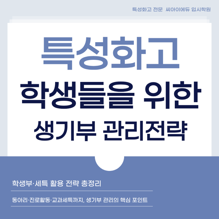 동아리·진로활동·교과세특까지, 생기부 관리의 핵심 포인트 안녕하세요. 특성화고 전문 학원 씨아이에듀입니다. 특성화고 학생들을 상담하다 보면 이런 질문을 정말 자주 받습니다. “내신도 중요하다는데, 학생부는 뭘 어떻게 준비해야 하나요?” 특성화고 진학에서 학생부는 ‘보조 자료’가 아닙니다. 오히려 내신 점수가 비슷할수록 학생부의 완성도가 합격을 가르는 결정적인 요소가 됩니다. 오늘은 ✔ 진학을 희망하는 특성화고 학생이라면 ✔ 반드시 알고 있어야 할 학생부·세특 활용 전략을 동아리·진로활동·교과세특까지 포함해 정리해 드립니다. 1. 학생부, 대학은 이렇게 봅니다 많은 학생들이 “활동을 많이 하면 좋은 학생부 아닌가....... <img src="https://blogthumb.pstatic.net/MjAyNjAyMTBfMjg3/MDAxNzcwNjk3ODU4Njc4.8ic0_xh-3crv_tMpBVB--i2_nnWSdLTpM-NRvGDuP3cg.4qzs2huWLYwf6_Dv7w_IORuTtJbbu7klBlL77BTa7msg.PNG/1.png?type=s3" />