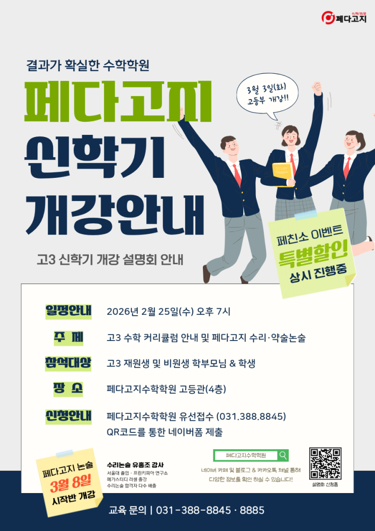 평촌학원가 중고등수학전문학원 페다고지수학학원 입니다. 페다고지학원에서 고3 학부모님들을 위한 설명회를 개최 합니다! 고3 학부모 설명회 2월 25일(수) 오후 7시에 진행! 3월 새학기 개강 대비 고3 설명회를 진행 합니다. 이번 설명회 에서는 고3 새학기를 어떻게 보내야 할지? 페다고지 고3 커리큘럼에 관한 설명과 함께 수리논술 · 약술논술 등 여러 입시 전략에 대한 안내를 전해드리고자 합니다! 설명회는 평촌학원가에 위치한 페다고지수학학원 고등관(4층)에서 진행됩니다. 입시전문가이자 수학 일타강사인 페다고지 김진혁 입시팀장님이 설명회의 주요 내용을 전달하게 되며, 설명회 후에는 학부모님들과의 질의응답 시간도 가질 예....... <img src="https://blogthumb.pstatic.net/MjAyNjAyMTNfMjg4/MDAxNzcwOTUxNTc4OTM1.vY4kKGXzWI3EsgdYGeZSHNukSm5VJRCPIWBSMtKr2z8g.cL2r0_uV7nZ1iGFBTMJ26sjBzH52qWa9nRXeHC71V2sg.PNG/3%BF%F9_%B0%B3%B0%AD_%BC%B3%B8%ED%C8%B8-_%BA%B9%BB%E7%BA%BB.png?type=s3" />