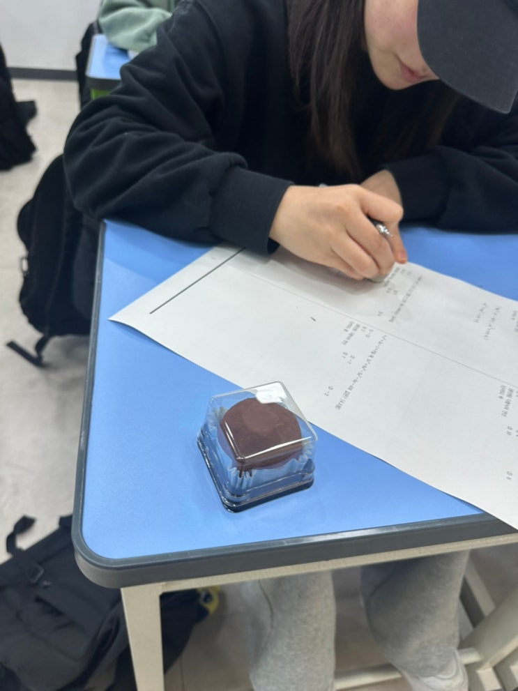 고1 반 수업 시간에 깜짝 수학 퀴즈를 냈습니다. 사실 그냥 지나갈 수도 있는 수업이었지만, 아이들 눈빛에 생기를 불어넣고 싶어서 나름의 '당근'을 제시했죠. "이 문제 맞히는 사람, 요즘 핫한 두쫀쿠 쏜다!" 제 말이 떨어지기가 무섭게 눈동자들이 반짝거리기 시작하더라고요. (평소에도 이렇게 집중해 주면 참 좋으련만! ) 문제 난이도가 꽤 있었는데, 포기하지 않고 끝까지 머리를 맞대던 녀석들 중 한 명이 결국 정답을 외쳤습니다. 약속은 약속이니까요! 오늘 바로 구하기 어렵다는 두쫀쿠를 사서 전달했습니다. ㅎㅎ <img src="https://blogthumb.pstatic.net/MjAyNjAyMDlfODQg/MDAxNzcwNjQ1Nzg2MDg0.ncBKt1z7E8O68atGUWCPnz8_JNJw3Y37AHme9ss_Iv0g.y3CZeSekODzd9pUTzPwxa7ScNK0_hmO3g1sogQcPolwg.JPEG/IMG%A3%DF5451.jpg?type=s3" />